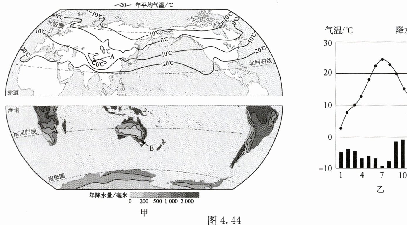 9. 图4.44甲为北半球年平均气温分布图和南半球年降水量分布图,乙为某地气候资料图。读图,回答下列问题。