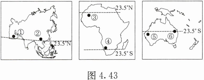 7. 世界年降水量分布的一般规律:在南、北回归线两侧,大陆西岸降水少,大陆东岸降水多。如图4.43所示,①-⑥地降水丰富的是(