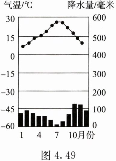 读某地气温曲线和降水量柱状图(图4.49),完成1~2题。