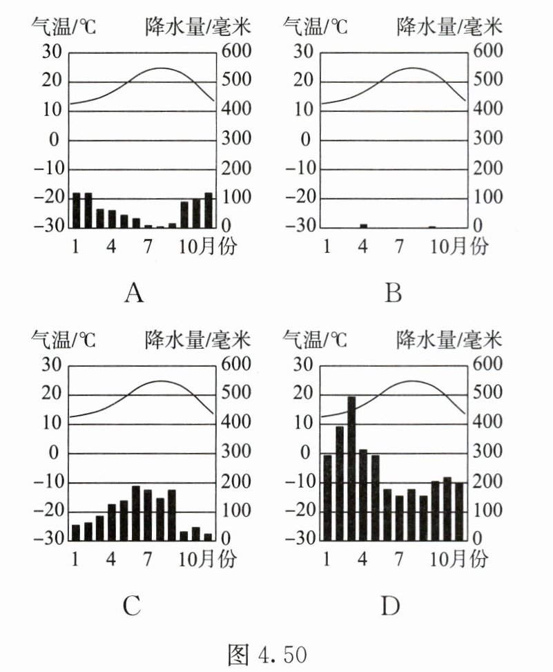 3. 读以下四种不同气候类型的降水量和气温变化曲线图(图4.50),属于地中海气候的是(