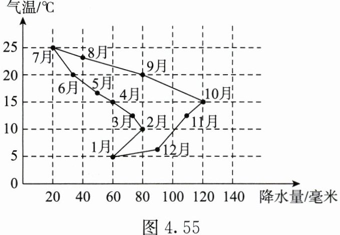 气候数据有多种呈现方式。图4.55是把代表月份的数字标注在以气温和降水量为坐标的图上,点在图上的坐标就是该月的平均气温和降水量。读图,完成1~3题。
