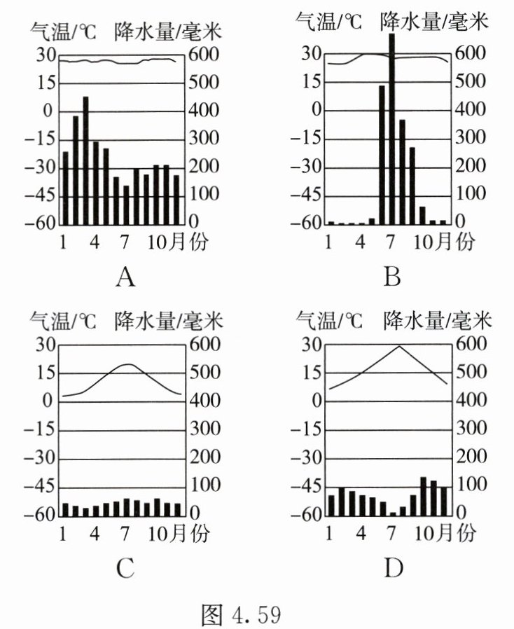 5. 我们平常所用的调味料——胡椒,是一种藤本植物,攀生在树木或桩架上。它只能生长在年降水量 2500 毫米以上的热带地区,因此适合它生长的气候环境应是图 4.59 中的(
