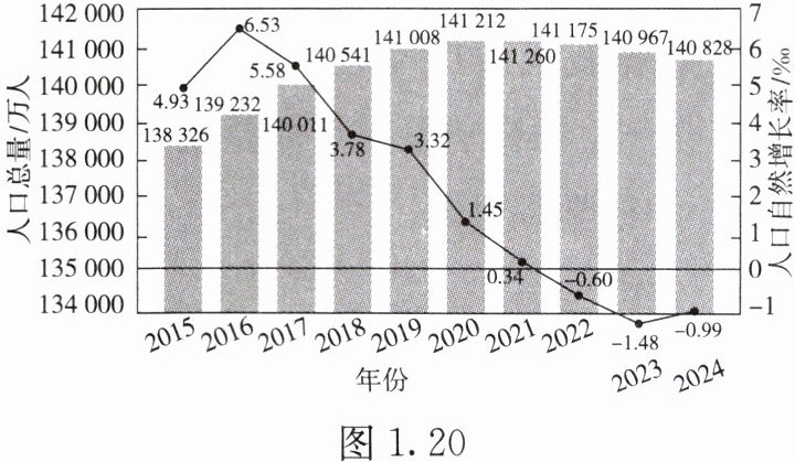 2025 年 1 月 17 日,国家统计局公布的人口数据显示,2024 年年末全国(包括 31 个省、自治区、直辖市和现役军人的人口,不包括居住在 31 个省、自治区、直辖市的港澳台居民和外籍人员)出生人口 954 万人,死亡人口 1 093 万人。读我国近十年人口数据统计图(图 1.20),完成 1~2 题。