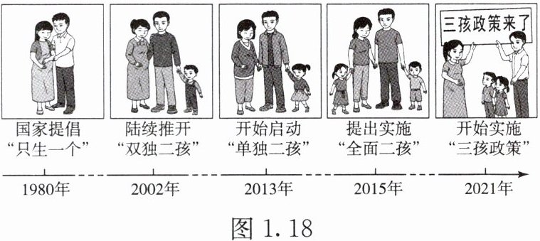 2024 年 9 月,全国实施渐进式延迟法定退休年龄,坚持小步调整、弹性实施、分类推进、统筹兼顾的原则。图 1.18 示意改革开放以来我国的人口生育政策进行的动态调整。据此完成 2~4 题。