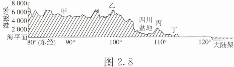读我国沿 $32^{\circ}N$ 纬线的地形剖面示意图(图 2.8),完成 1~2 题。