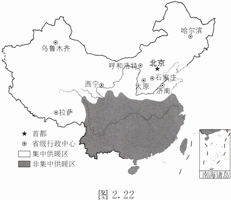 集中供暖是指向建筑物供给热量,保持室内舒适温度的社会服务。读我国集中供暖区分布图(图2.22),完成2~3题。