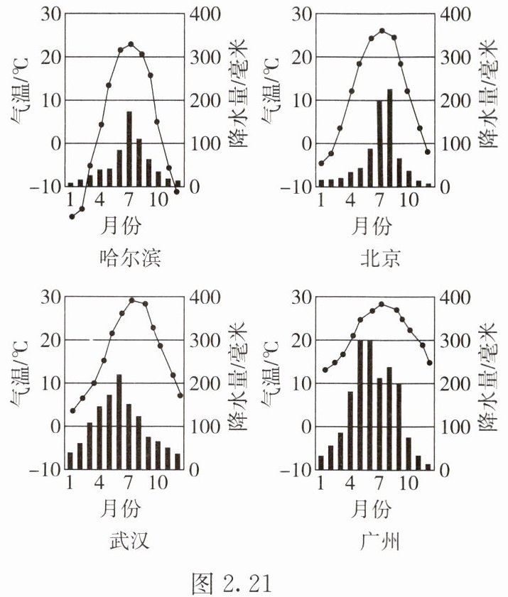 图2.21中的四幅图为我国哈尔滨、北京、武汉、广州四个城市多年平均各月气温和降水量图。读图,完成3~4题。