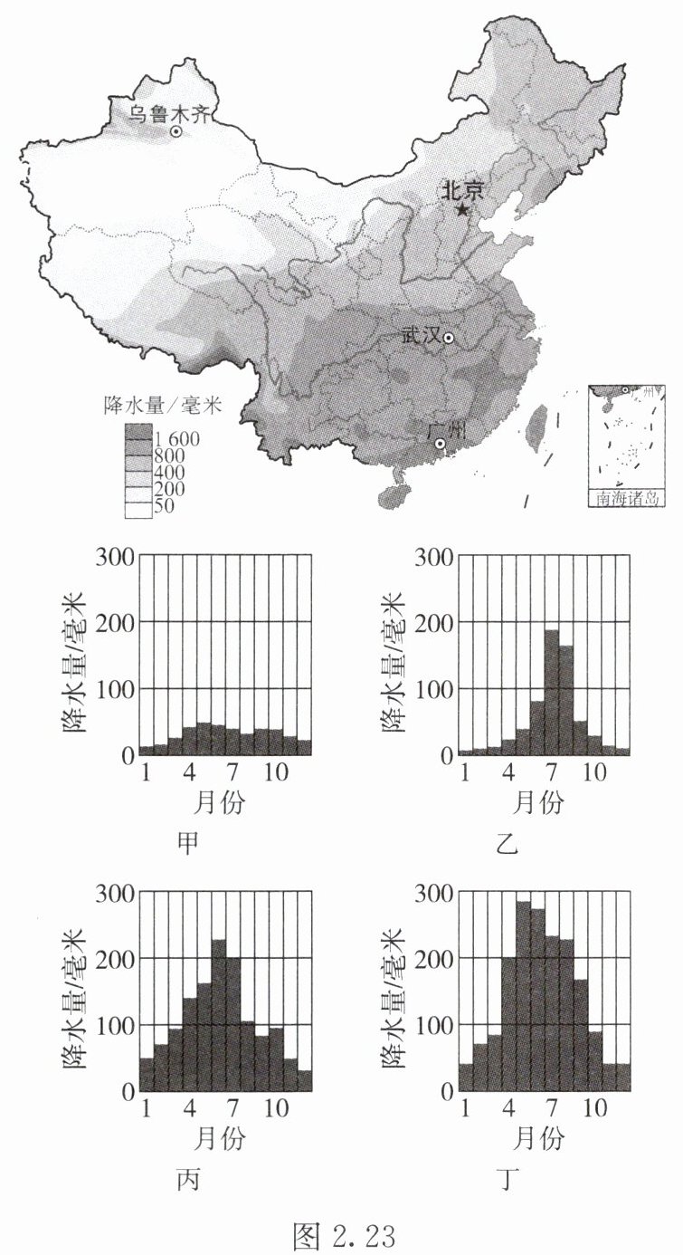 分析降水量分布状况是认识区域差异的重要内容。图2.23为中国年降水量分布和四地多年平均各月降水量柱状图。读图,完成4~6题。