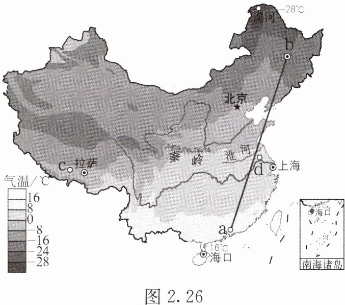 7. 读中国1月平均气温分布图(单位:$^{\circ}C$)(图2.26),完成下列要求。