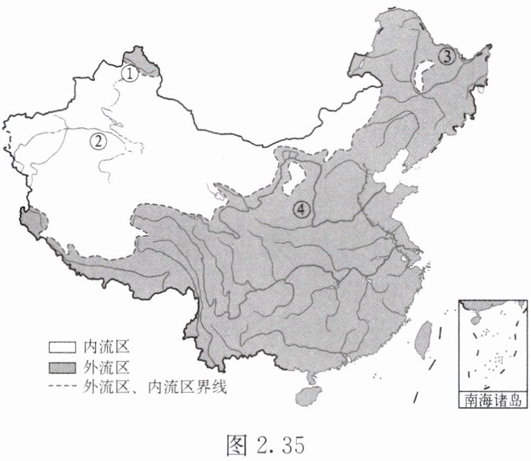 读我国内流区与外流区分布图(图2.35),完成2~3题。