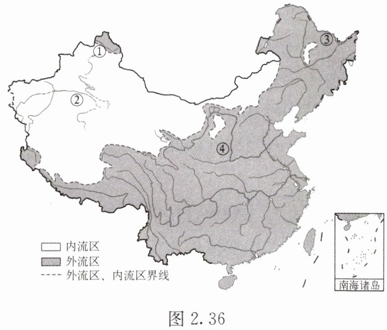 我国是世界上河流众多的国家之一,有许多源远流长的大江巨川,这些河流为沿岸民众提供了生产生活的便利,孕育了华夏文明。读我国内流区与外流区分布图(图2.36),完成2~3题。