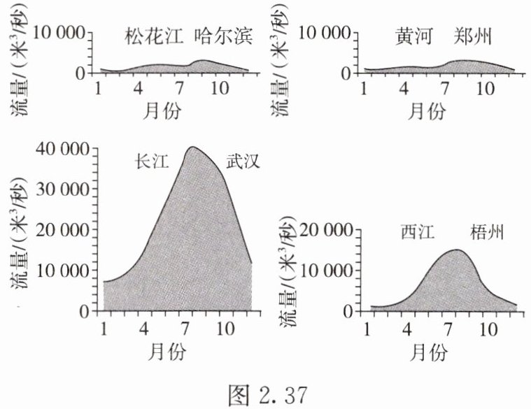 读我国东部主要河流流量的年变化曲线图(图2.37),完成5~6题。