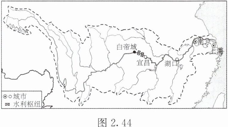 诗句“朝辞白帝彩云间,千里江陵一日还”,描述了长江干流某河段当时的特点。读长江干流分布示意图(图 2.44),完成 3~5 题。
