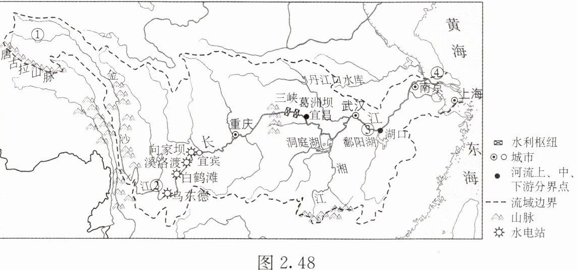 随着白鹤滩水电站全面投产发电,金沙江下游的乌东德、白鹤滩、溪洛渡、向家坝四座大型水电站,与葛洲坝水利枢纽、三峡工程“连串成珠”,共同构成了世界最大的“清洁能源走廊”,实现了“一滴水发 6 次电”的中国奇迹。图 2.48 为长江流域分布示意图。读图,完成 5~7 题。