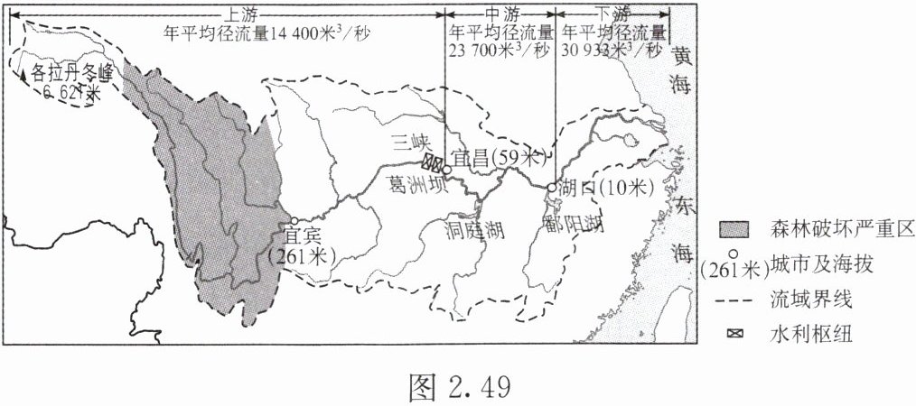 8. 2024 年 7 月 5 日 16 时许,湖南岳阳市华容县团洲垸洞庭湖一线堤防因暴雨决堤。读长江流域分布示意图(图 2.49),完成下列要求。