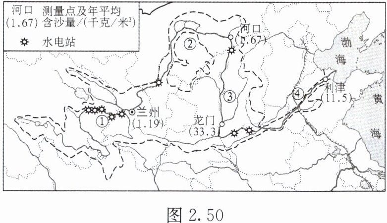 黄河全长 5400 多千米,为我国第二长河。唐代诗人李白曾吟诵:“黄河之水天上来,奔流到海不复回。”读黄河不同河段年平均含沙量图(图 2.50),完成 1~3 题。