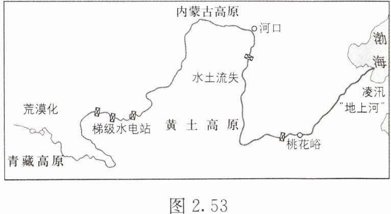 黄河哺育了灿烂的中华文明,但黄河流域也存在一些环境问题。图 2.53 为黄河各个河段的特征。读图,完成 5~6 题。