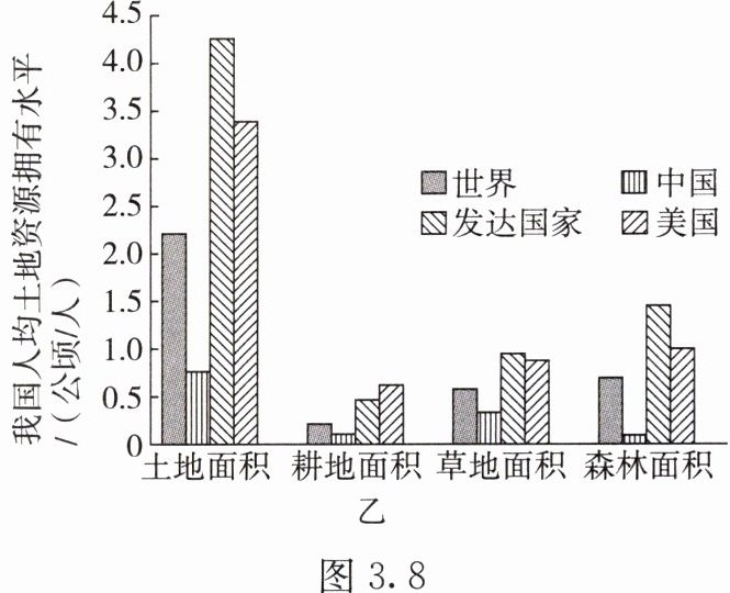 (4)读图乙,我国幅员辽阔,土地资源总量丰富。但是,由于人口众多,我国土地资源人均占有量