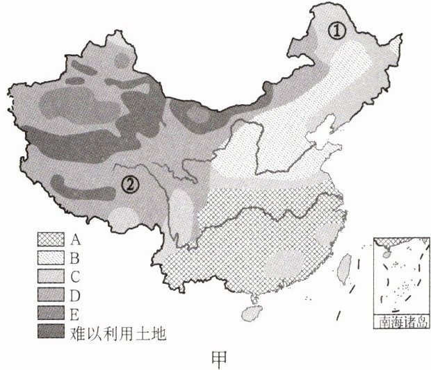 (填气候类型)分布区。(2)图甲中土地利用类型 $A$ 和 $B$ 的分界线大致是