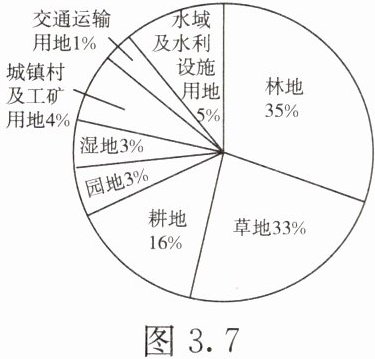 对于土地和耕地,我们应该认识到“中国人的饭碗任何时候都要牢牢端在自己手中”“保护耕地要像保护文物那样来做,甚至要像保护大熊猫那样来做”。读中国可利用的土地资源类型统计图(图 $3.7$),完成 $5\sim6$ 题。