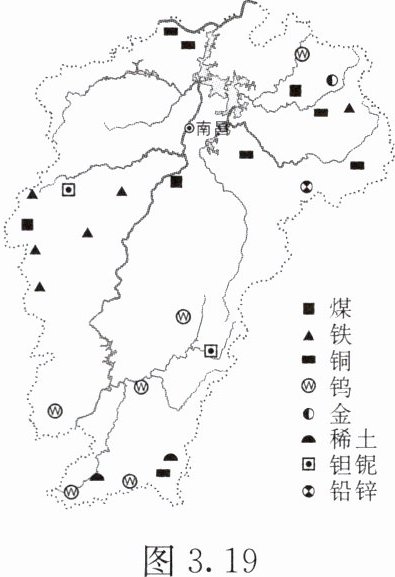 江西省矿产资源丰富。图 3.19 示意江西省主要矿产分布。读图,完成 1~3 题。