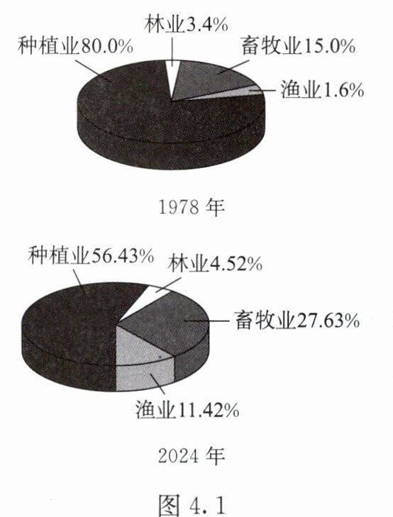 改革开放40多年来,我国农业发展取得历史性成就,14亿多中国人的饭碗牢牢端在自己手中。读农业产业结构产值构成变化图(图4.1),完成1~2题。