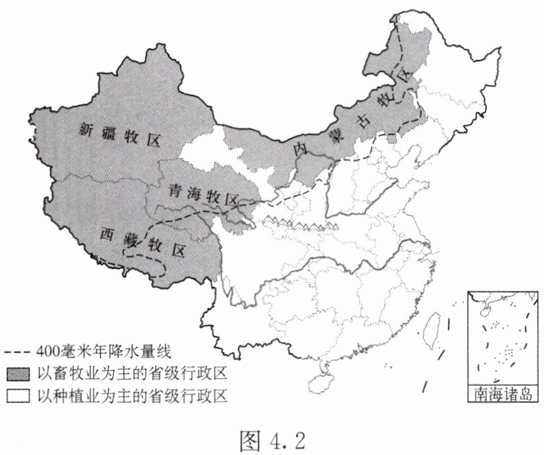 农业是我们的衣食之源,生存之本。我国地域辽阔,自然环境复杂多样,农业的地区差异显著。读我国主要的畜牧业区和种植业区分布图(图4.2),完成4~6题。