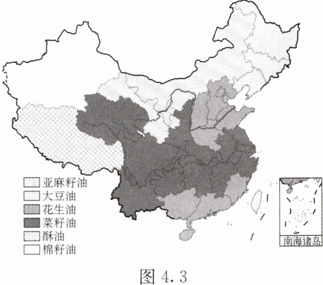 我国食用油种类丰富,各地区对食用油种类偏好不同,随着制油技术提高,牡丹籽油、稻米油等多种高品质食用油出现在中国人的餐桌上。读我国各地食用油偏好分布图(图4.3),完成7~9题。