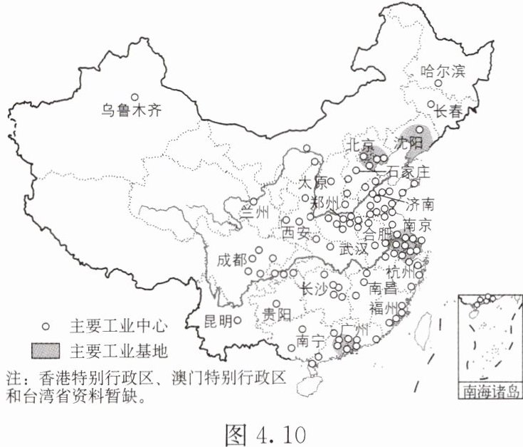 近年来,我国工业从“制造”走向“智造”,从“追随”变为“领先”。读我国主要工业中心及工业基地分布图(图4.10),完成3~4题。