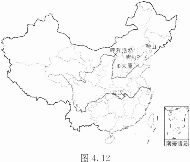 我国工业生产部门齐全,轻、重工业发展都较快;农业生产类型多样,地区差异明显。读我国部分钢铁工业基地分布示意图(图4.12),完成2~4题。