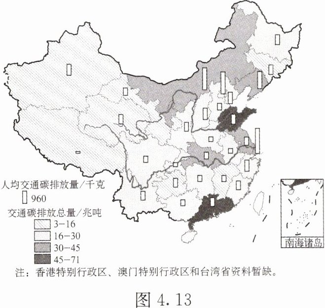 为应对全球气候变化的严峻挑战,我国承诺2030年前实现碳达峰,将采取能源转型、节能降碳、工业交通低碳等措施,确保如期实现碳达峰目标。海南省率先提出2030年起全省全面禁售燃油车,大力发展新能源汽车。据专家介绍,气温会影响电池组的活性,一般在寒冷的冬季,纯电动车的续航里程会有所下降。图4.13为某年中国交通运输碳排放总量空间分布图。读图,完成5~7题。