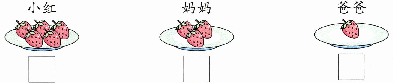 小红一家三口分得同样多的草莓,他们都吃了一些,剩下的草莓如下图所示,谁吃的草莓最多?在□里画“√”。