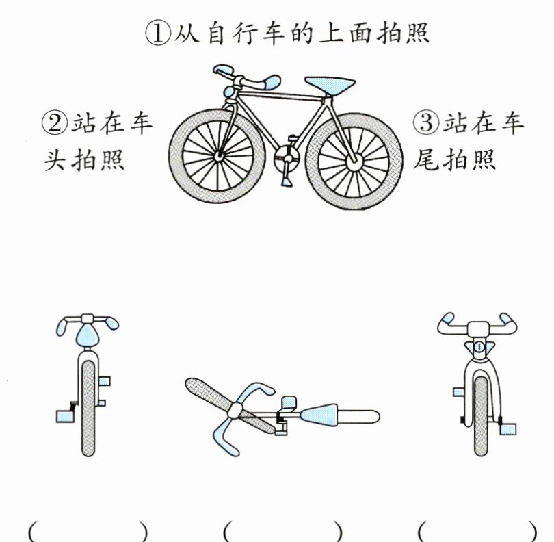 2. 下面三张照片是站在自行车的哪个位置拍到的?请将序号填在括号里。