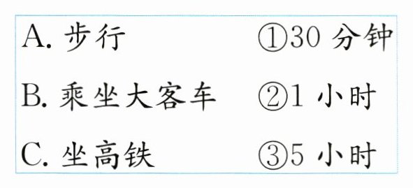 3. 他们选择什么出行方式比较合适?大概需要多长时间才能到达?选一选。