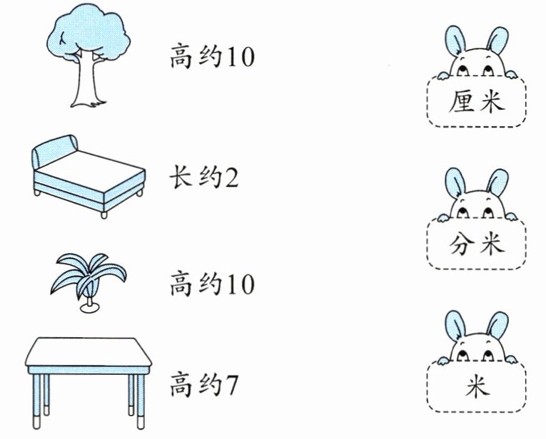 树高约$10$米;床长约$2$米;盆栽高约$10$分米;桌子高约$7$分米。