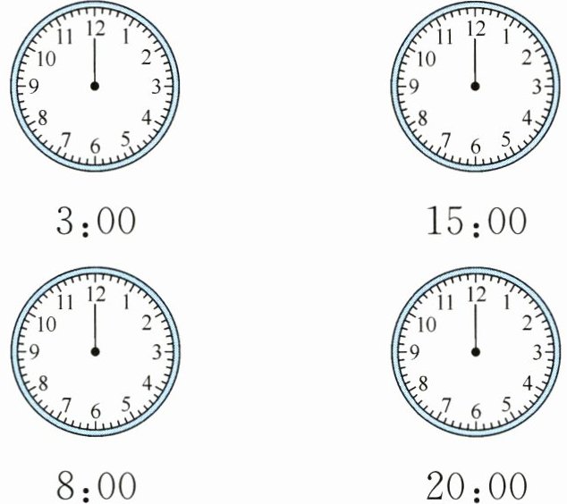 (在对应钟面画出指向相应数字的短粗时针即可,如3:00时针指向3,15:00时针指向3和4中间靠近3可简化为说指向3,8:00时针指向8,20:00时针指向8)。