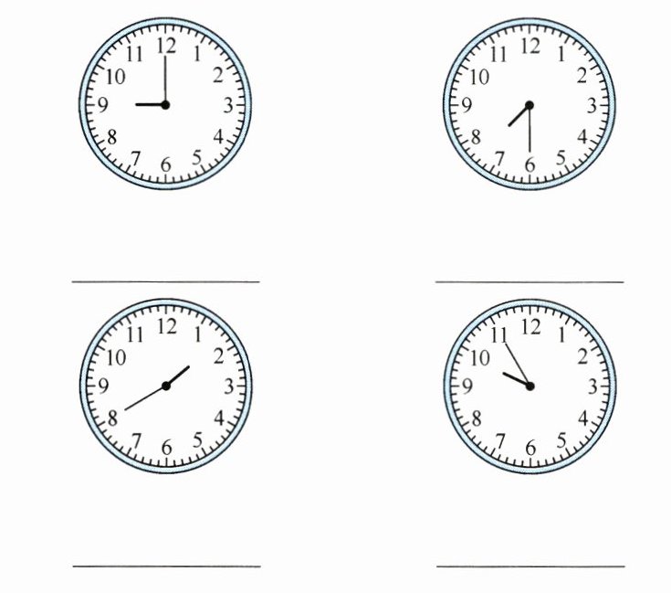 右上钟面:时针指向3(原图为12点钟面不正确,应按15:00,时针指向3的下方一些,按该年级可简化为指向3和4中间靠近3,本题作答以简化指向数字表示);