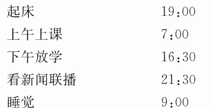起床——7:00;上午上课——9:00;下午放学——16:30;看新闻联播——19:00;睡觉——21:30(按题目顺序横向对应连接答案可视为整体正确连接情况)