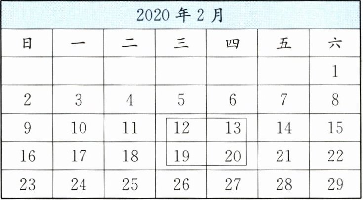 2. 下面是 2020 年 2 月份的月历。