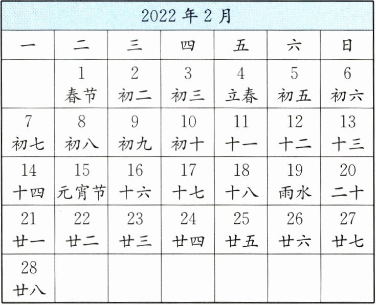 )日是春节。(2)2022 年的 2 月有(
