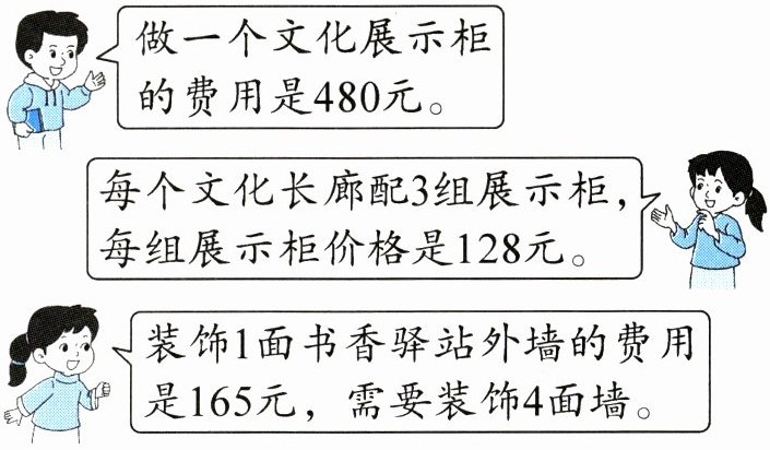 (1)每个文化长廊购买展示柜需要多少元?128×3=384(元)