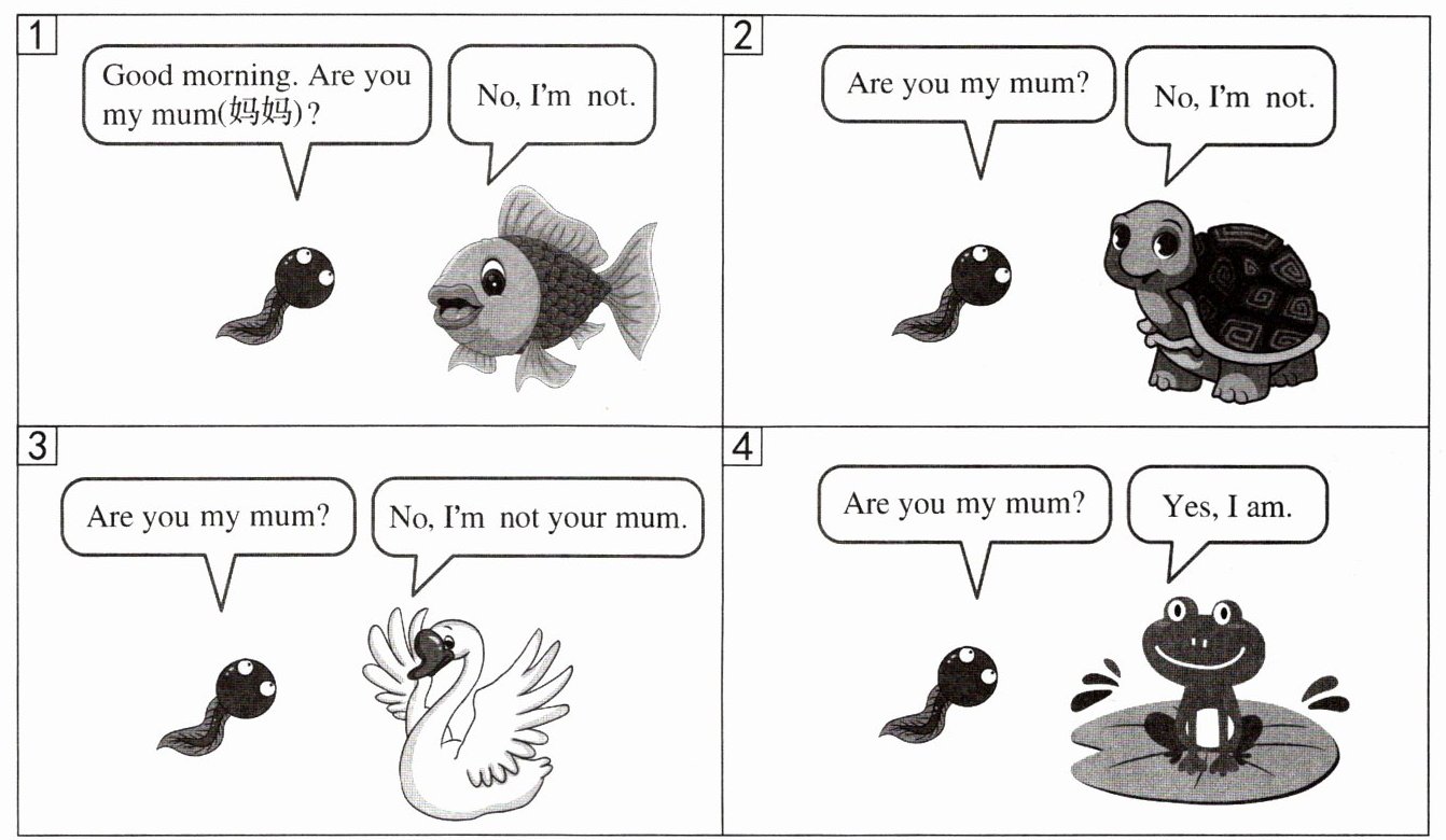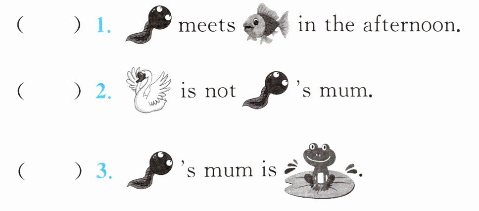 五、你一定听过小蝌蚪找妈妈的故事吧!仔细读一读,根据绘本内容判断句子正(T)误(F)。
