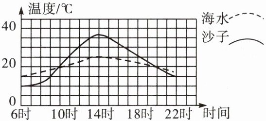 1. (江苏盐城校级期中)小明在海边玩耍,感觉沙滩上的沙子很热,海水却比较凉爽。某天,他从 6 时到 22 时对相同质量的沙子和海水的温度进行了测量,绘成的温度随时间变化图像如图所示。下列分析不正确的是(