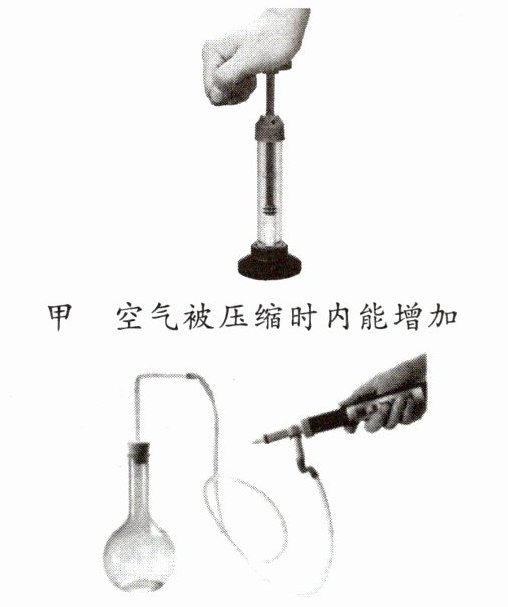 增大。- 如图乙所示,圆底烧瓶内有一些水,水的上方有水蒸气。通过打气筒给瓶内打气,达到一定程度时,瓶塞跳出,同时还能看到瓶口出现白雾。瓶塞跳出过程中的能量转化过程是