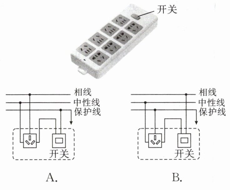 7. (河北中考)小明家的一个插线板如图所示,他在使用中发现:插线板上的开关闭合时插孔能提供工作电压。图中电路的连接符合上述要求及安全用电原则的是(