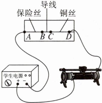 1. (山东淄博中考)长短、粗细均相同的保险丝和铜丝,分别接到线路板上 A、B 间和 C、D 间,如图所示。移动滑动变阻器的滑片,发现保险丝熔断而铜丝完好。下列说法错误的是(