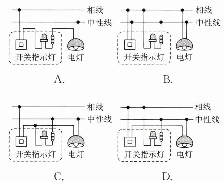 8.(江苏扬州邗江区校级三模)用带指示灯的开关控制阳台电灯,闭合开关,两灯都亮;断开开关,两灯都灭。使用时发现:指示灯因断路不亮,电灯照常发亮。下列设计与其符合的是(