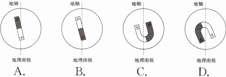 C [磁性是指能够吸引铁、钴、镍等物质的性质,鱼形铁是用铁制成的,能被磁体吸引,故A正确,不符合题意;地磁场的南极在地球的北极附近,地磁场的北极在地球的南极附近,如题图所示,指南鱼鱼头指向北方,根据异名磁极相互吸引,指南鱼鱼头应标注“N”,故B正确,不符合题意;指南鱼被磁化后,周围存在磁场,而磁感线实际不存在,是为了描述磁场的分布假想的曲线,故C错误,符合题意;指南鱼是一个磁体,两个磁极位置的磁性最强,中间最弱,因此,指南鱼的腹部磁性最弱,故D 正确,不符合题意。]