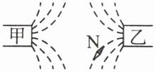 4. (浙江金华中考)甲、乙为不同条形磁铁的两个磁极,弧线是部分未标方向的磁感线,如图所示。根据图中小磁针静止时的指向判断甲、乙的磁极,下列描述正确的是(