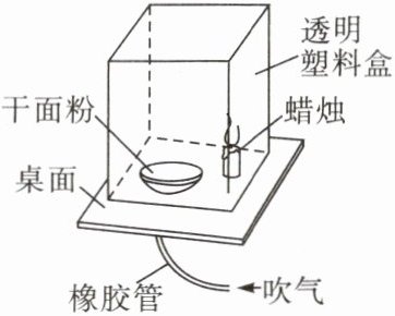 10. 如图所示,在水平桌面上放置一个底部接通橡胶管的塑料小碗,其中放入适量干燥面粉,再罩上一个透明塑料盒,从橡胶管一端快速吹气,飞扬的面粉在接触到烛焰瞬间被点燃引发爆炸,塑料盒被冲飞。塑料盒被冲起的过程相当于汽油机的
